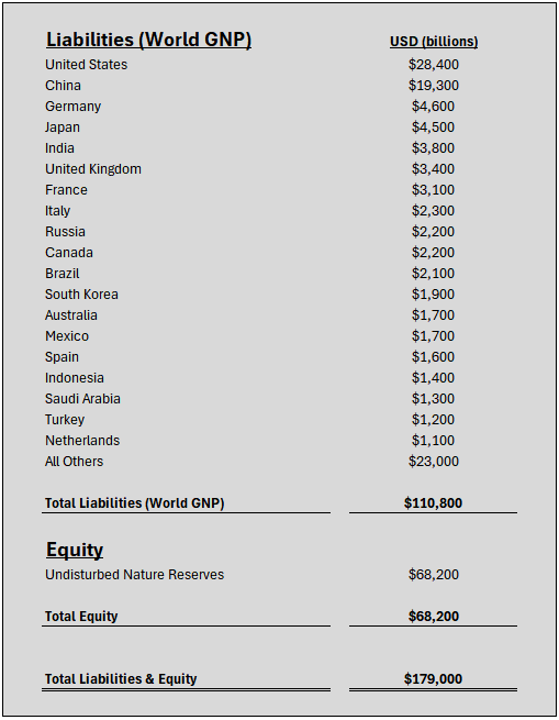 For the “liabilities & equity” side of the ledger, we desired to find a dataset that could appropriately match society’s reliance on the ecosystem services provided by nature as an asset base. Ultimately, we decided that Gross National Product (GNP) of all the world’s countries was the best option for the “liabilities” section of nature’s balance sheet. In our view, it is the world’s political classifications and the companies and individuals that operate under their flags that draw the most direct impacts on the natural world. Thus, we believe that this analysis is best served by accounting for the GNPs of each country as the main liability against nature’s ecosystem services. As shown below, the United States currently holds the largest liability against nature, representing 26% of global GNP as of 2024. China holds the next largest liability at 17%. It is an important matter of fact to acknowledge that the economies of the U.S., China, and all other countries of the world are wholly reliant on nature for their economic output and its measured value.