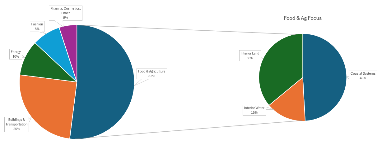 Within the Food & Agriculture segment itself, we again use data from de Groot et al (2012) to estimate the underlying segments within the industry that have the largest impacts on nature. As shown below, we believe that coastal systems represent almost half of food & agriculture pressures on nature, followed by interior land-related pressures at 36% of the category, followed by interior water-related pressures at 15%.