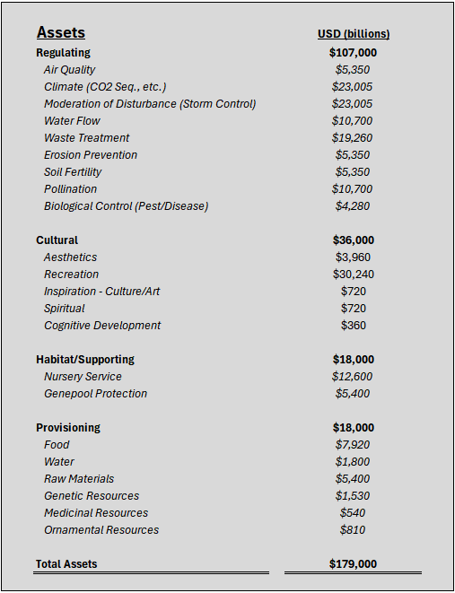 Over the past 40 years, human beings have increasingly worked to better understand the economic value of nature and the services that it brings to bear for society. These “ecosystem services” include production of the oxygen that we breathe alongside inputs for the food that we eat, the medicine that we use, and the clothes that we wear, among many other functions. The important work to assign a value to these ecosystem services is largely agreed to have started with Costanza et al and their seminal paper published in the journal, Nature, in 1997, whereby an initial value of $33 trillion was assigned to the natural world at that time. Many updates have since occurred, with one of the more recent estimates coming from Zero Carbon Analytics in early 2025, based on work completed by Boston Consulting Group (BCG) in 2021. This most recent estimate assigns a global value of $179 trillion to nature.