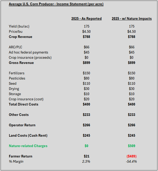 In short, the average U.S. corn farmer would go from eking out a gain of $21/acre in 2025 to losing $489/acre if he was made to account for his theoretical contributions to the degradation of nature, as shown in the illustrative income statement comparison below.